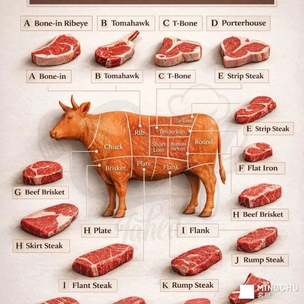 A 带骨肋眼B 战斧牛排C T骨牛排D 红屋牛排A 带骨肋眼B 战斧牛排C T骨牛排E 纽约客牛排肋部里脊短腰肉下腰肉圆形部位腹部侧腹F 平铁牛排G 牛胸肉H 腹部肉I 侧腹肉J 臀肉牛排K 臀肉牛排L 菲力牛排H 裙肉牛排I 侧腹牛排K 三尖肉