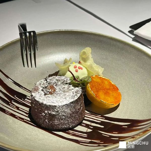 这道“熔岩蛋糕配哈密瓜冰淇淋和脆片”是非常经典且讨喜的餐厅级甜品搭配。热与冷、苦甜与清新、软心与酥脆的口感对比,让它很有层次感。