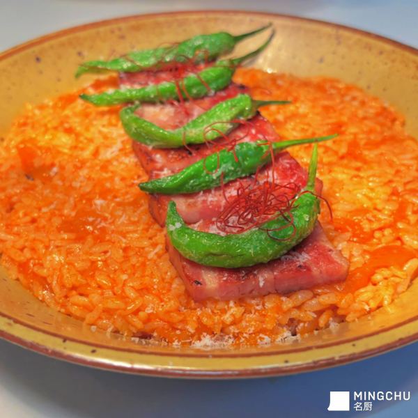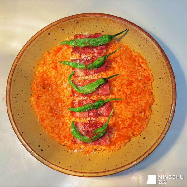 这是一道韩式风味+意式烩饭技法+湘味高端食材的创意融合菜。基底源自韩国经典家常料理泡菜饭,韩式泡菜经乳酸发酵,自带酸辣鲜香的标志性风味,是韩餐核心灵魂食材;烩饭形态借鉴意大利Risotto慢煮收汁技法,赋予米饭绵密浓稠的口感;搭配西式经典食材培根的咸香焦香,点缀湖南湘阴地标级高端食材樟树港辣椒,将韩、意、湘三方风味与技法结合,打造出适配餐厅的创意融合主食。