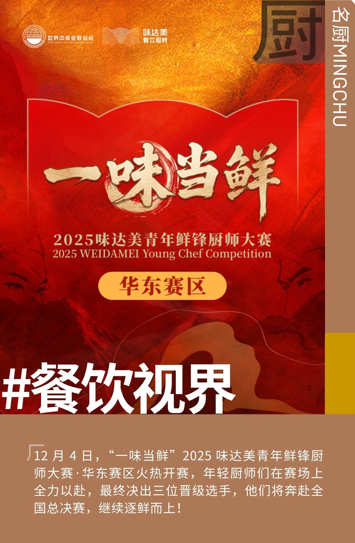 以技艺为基,以鲜味为魂,以青年为本,以理念为核。味达美餐饮服务携手世界中餐业联合会主办、江苏省餐饮行业协会协办、「名厨MINGCHU」 作为官方媒体合作伙伴的“一味当鲜”2025 味达美青年鲜锋厨师大赛,持续打造高规格专业竞技舞台,为新生代厨师提供展示实力与交流学习的舞台,推动行业“鲜锋力量”不断向前。