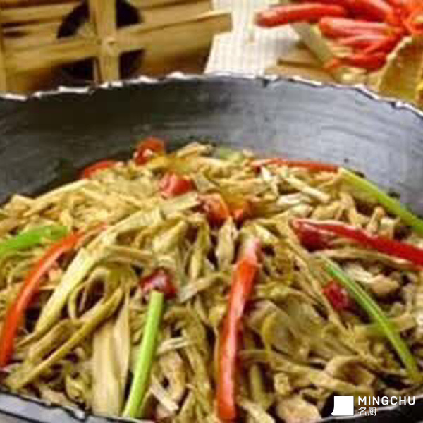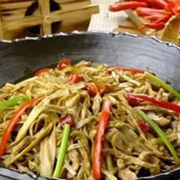 3、锅内下入麻辣油烧至六成热,放入五花肉丝、腊肉丝小火煸香后下入美人椒圈、蒜茸、蚝油炒香,倒入煨好的烤笋丝翻炒均匀,加入高汤150克大火烧开,改小火下入一品鲜、味精、鸡精、胡椒粉调味,出锅时撒上葱段。