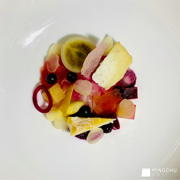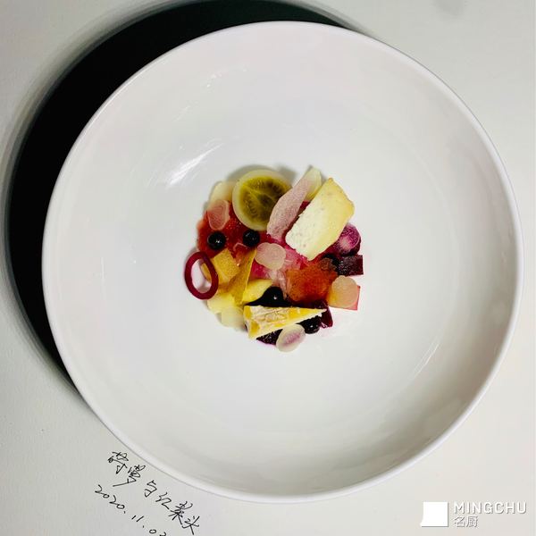 发酵蔬果有着无与伦比的跨越时间的味道,莳萝红菜头的发酵汁是这道菜的主基调,搭配羊脂球奶酪和意大利香醋分子球,构建了关于发酵食物的三位一体的风味的融合。是一道旨在诠释发酵之味的料理。