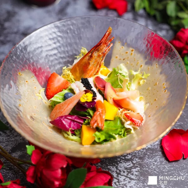 牡丹虾黑鱼子蟹柳蔬菜沙拉。