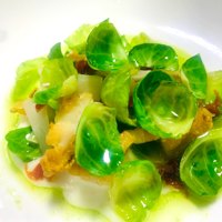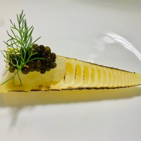 相较于一成不变的鸡汤煮,天妇罗的烹法反而更显本真。穿插百合的三种质地,细腻的百合泥、略带嚼劲的炸百合、鲜甜爽脆的清炒百合,提供了口感差别和味道变化的双重感官体验。轻煎的孢子甘蓝叶和百里香蒜烤圣女果以及萃取的香葱油,都使整道菜更丰富多彩。
