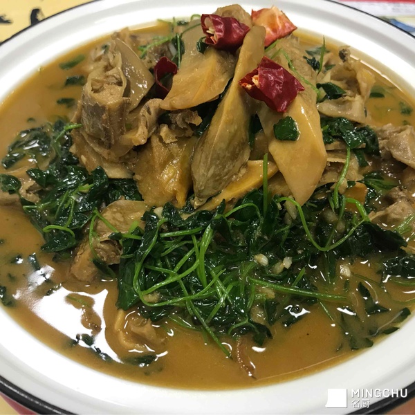 这道菜是当地吃河蚌季节每家店基本上都做的一道地方菜 在压河蚌时一定要加咸肉这样河蚌会更鲜 烧至时加入蒜泥的同时能把河蚌的鲜味和秧草的香味激发出来 烧时猪油要略微多点不然秧草不好吃