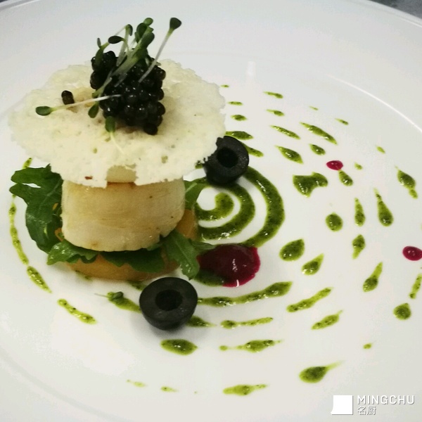 煎带子配卡露伽鱼子及青酱汁