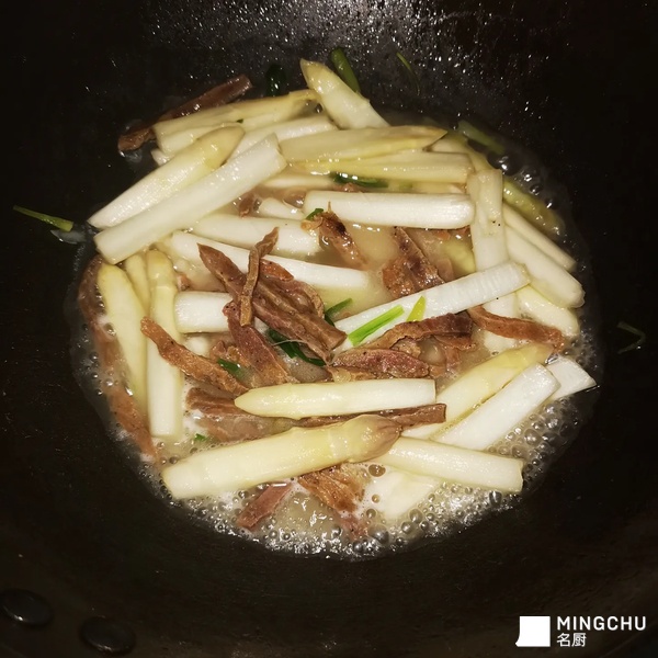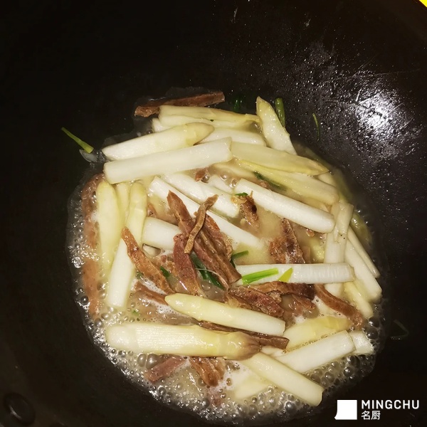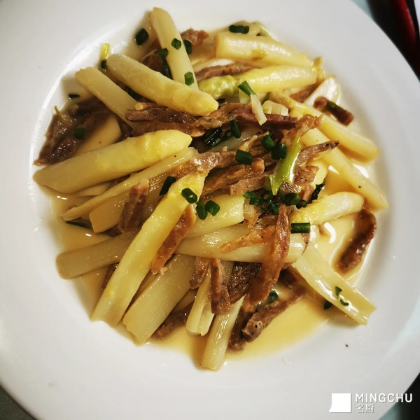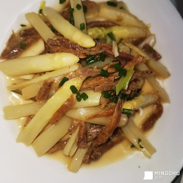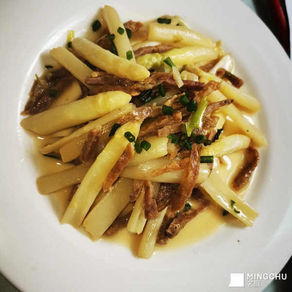 夏季的,白芦笋,翠嫩爽口,营养丰富,加入西班牙火腿清香不腻,咸鲜口味。