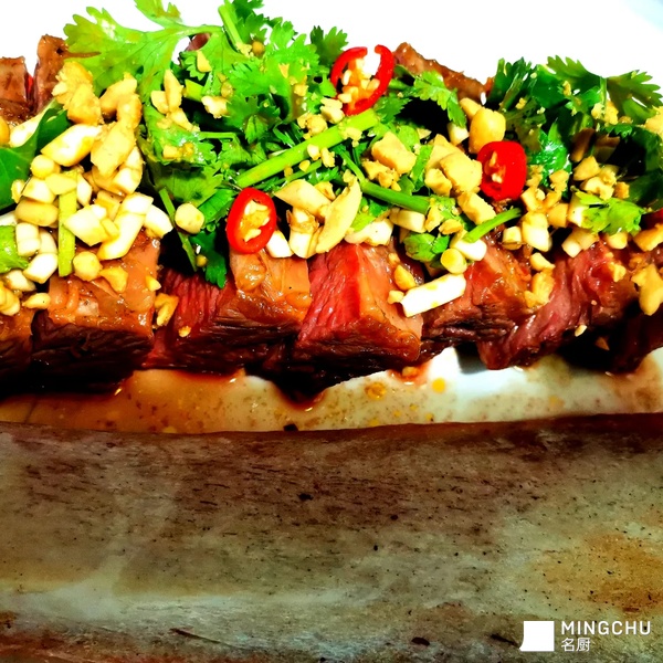 灵感来自于台塑牛排,个人对它的理解是中西式的卤水。于是想着做一个四川风味的牛肋排,加入了火锅底料,以及折耳根,香菜,花生,芝麻油等这些元素
