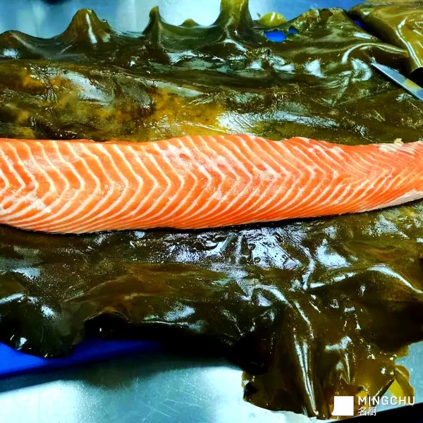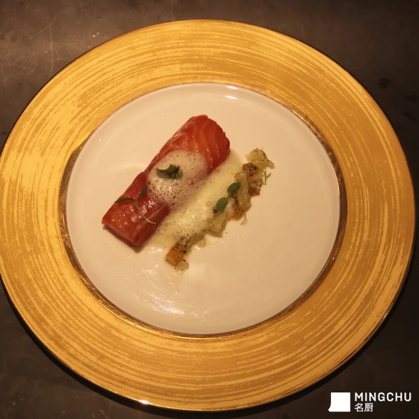 灵感来源于日本料理中对鱼肉熟成的方法,用昆布熟成后,鱼肉有一股昆布的香气以及鲜味,酱汁灵感来源于东京大饭店,当时想着是能否加入一点四川的元素,于是加入了泡青笋以及泡萝卜,酸辣的味道以及脆爽的口感使得这倒三文鱼多了更多层次
