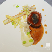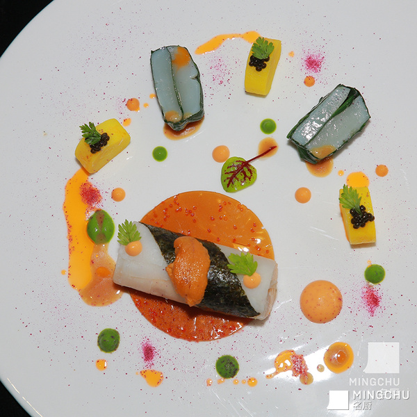 低温慢煮XO酱海鲈鱼卷配菠菜带子藏红花土豆青豆泥虾酱