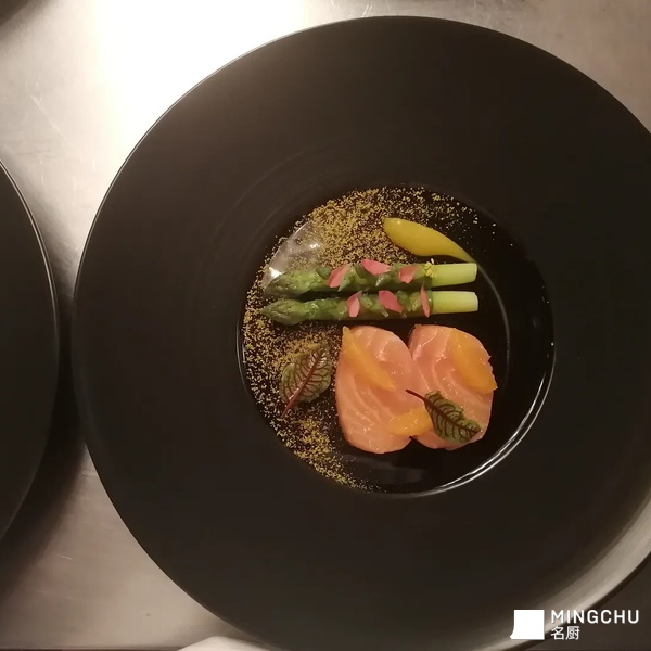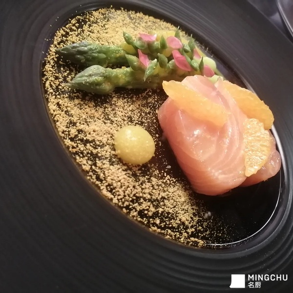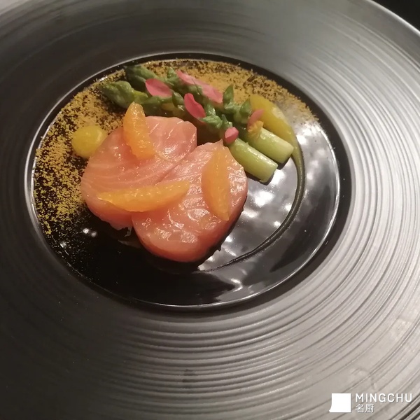 Slow cooked s almon Gravlax mandarin green asparagus