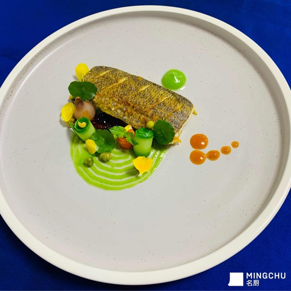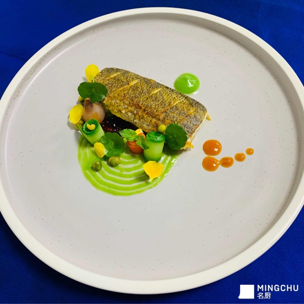 海鲈鱼带皮煎至金黄酥脆,蔬菜酱汁勾勒圆圈图案,搭配各色蔬菜及鱼子酱,一副夏天的景象跃然于盘中。