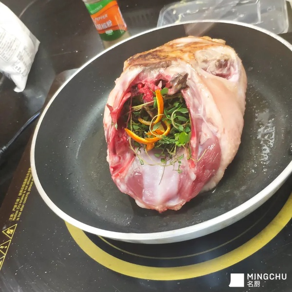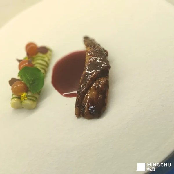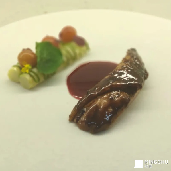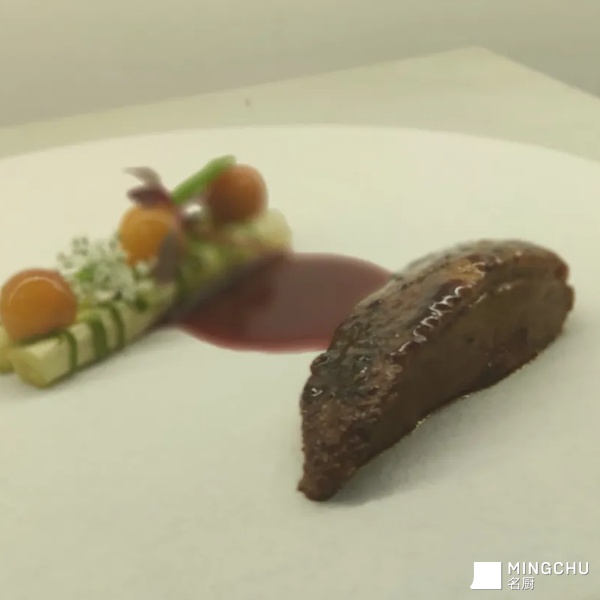 桂花焦糖糖浆提升鸭胸风味,这个季节樱桃刚刚好成熟,搭配糖渍樱桃的酸甜,中和鸭胸膻味使得鸭胸开胃且不腻,白芦笋增加复合口感