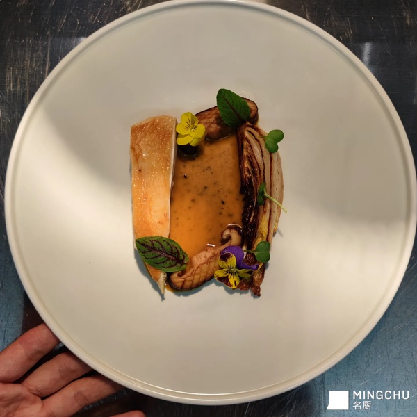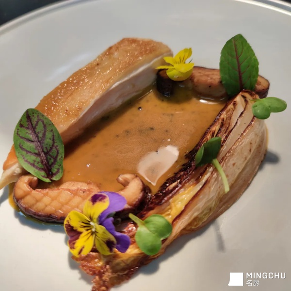 鸡肉与松露汁,娃娃菜与糖醋汁结合。鲜甜可口。