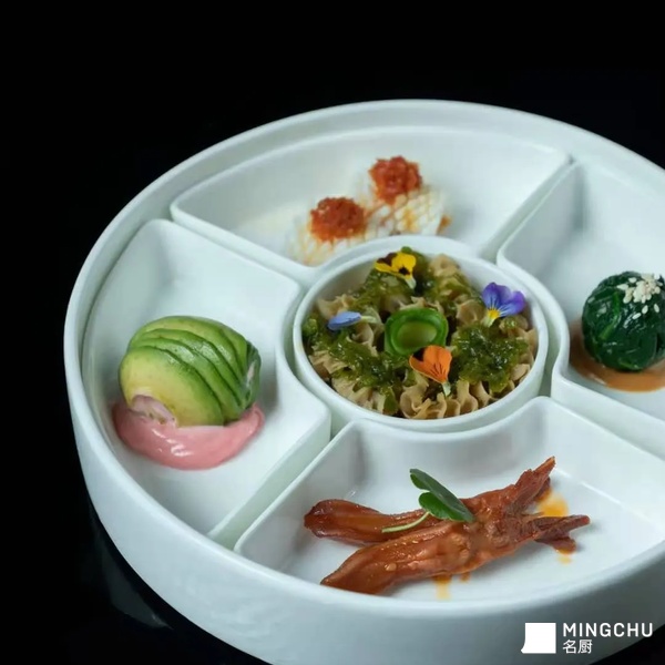 传统的碟上冷菜上桌不方便食用,我们给它换成可位上的。从荤素搭配,色彩,口味搭配几个方面来组合成菜!