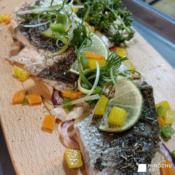 當充滿膠質的鱸魚排煎熟後,撒上充滿野味的刺蔥鹽香料,搭配酸酸的檸檬片、甜甜的水果彩椒丁,味道層層堆疊,真是美味啊!