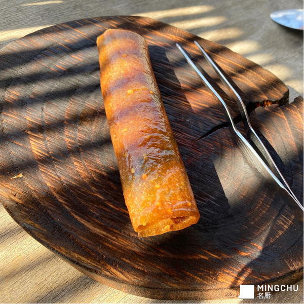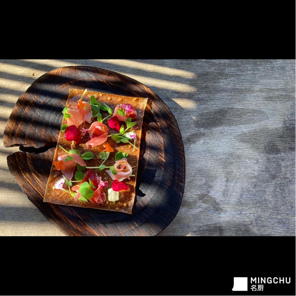 拋下幾片泛著堅果香鹹膩感的伊比利火腿,在裁好的芭樂果乾上點上檸檬膠,豆苗、酢漿草,放上火腿,幾瓣鹽漬玫瑰,然後一點蓳花。