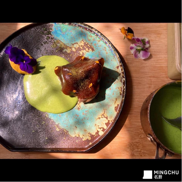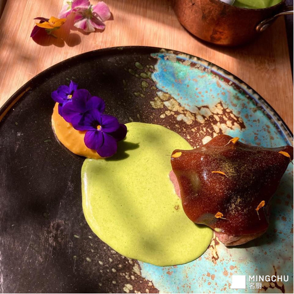 剝去仙桃的外皮,取出籽核;在牛奶裡丟幾顆丁香、一把孜然,燒熱,倒進仙桃的甜膩裡,攪勻;用一小撮鹽、兩塊奶油絲綢仙桃泥,過篩,備用。巧克力薄荷去梗洗淨後,45度風乾,打粉。