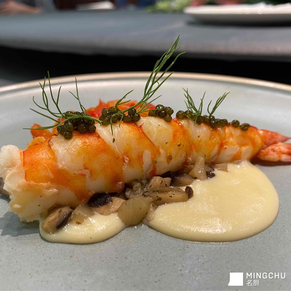 蒜仁经过牛奶烹调后,去除辛辣味,再打成泥铺地,上面放上菌菇,大明虾以低温慢煮方式,保留大明虾的嫩度和鲜甜,再以鱼子酱点缀。