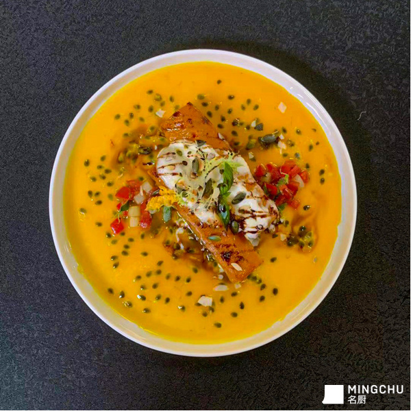 老南瓜刷上蜂蜜加上流心布拉塔芝士高温烤制熟透 铺上与酸酸甜甜的橙味百香果汁 一勺送入口中 南瓜的软绵 芝士的奶香浓郁 百香果的颗粒 橙味的酸甜 完全打开你的味蕾 仿佛站在了夏天的巅峰!
