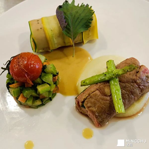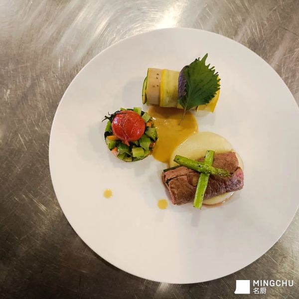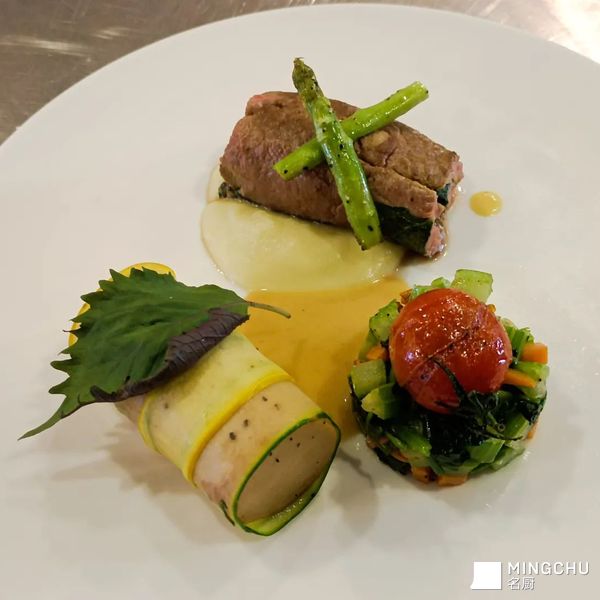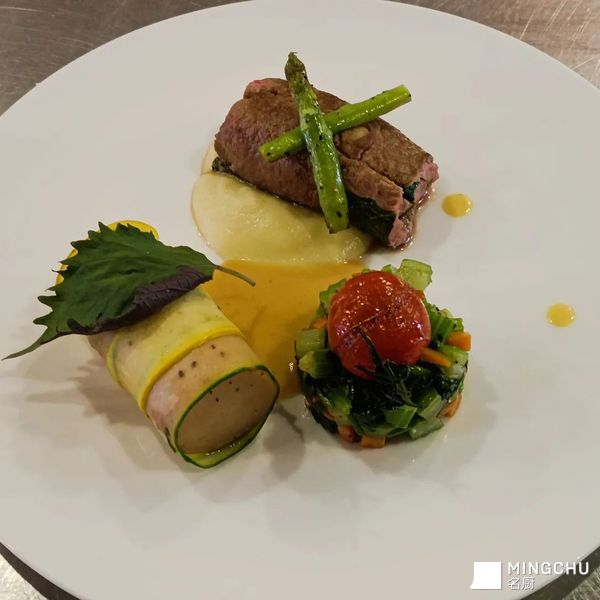 法式芥末牛肉蔬菜卷.配秋季香煎鸡肉火腿.配胡萝卜.芹菜.菠菜.圣女果.维生素蔬菜塔塔.配奶油土豆泥.配牛肉酱汁。