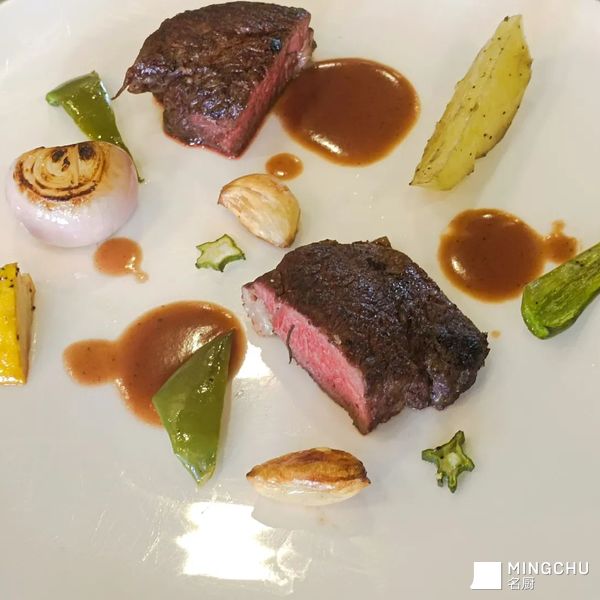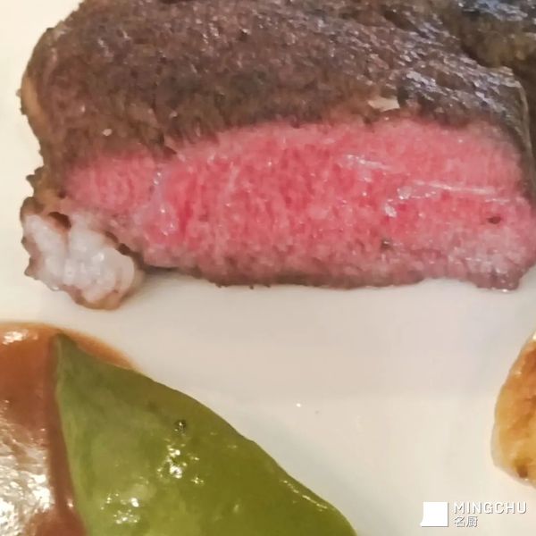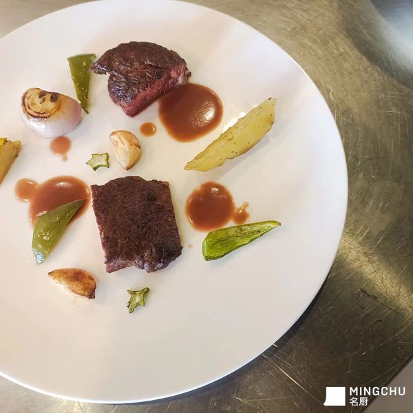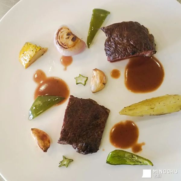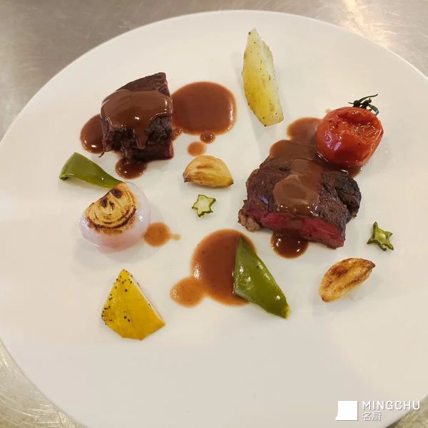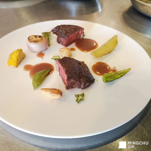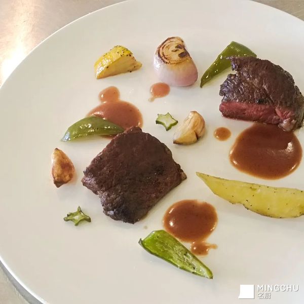 肉眼牛排配红酒汁配酒酿洋葱配烤蔬菜。