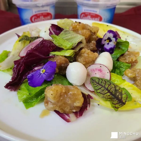 鲜蔬的爽脆口感调配黑松露口味汁,干酪切丁与牛奶混合热化拉丝裹上脆炸的猪颈肉粒。呈现方面五彩斑斓
