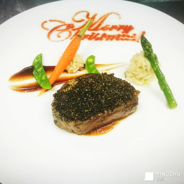 香草黑椒煎牛排配土豆泥芦笋萝卜