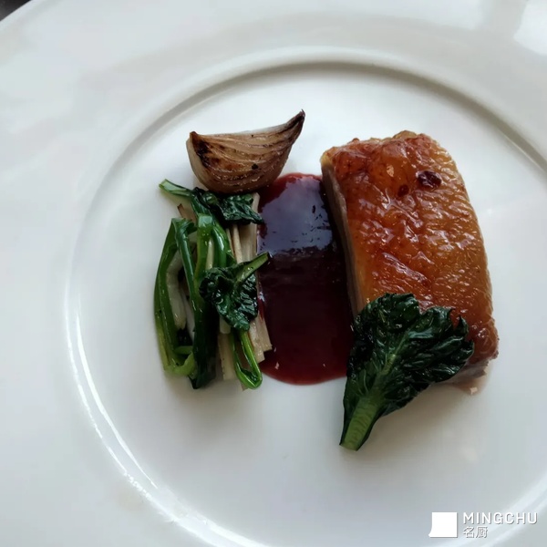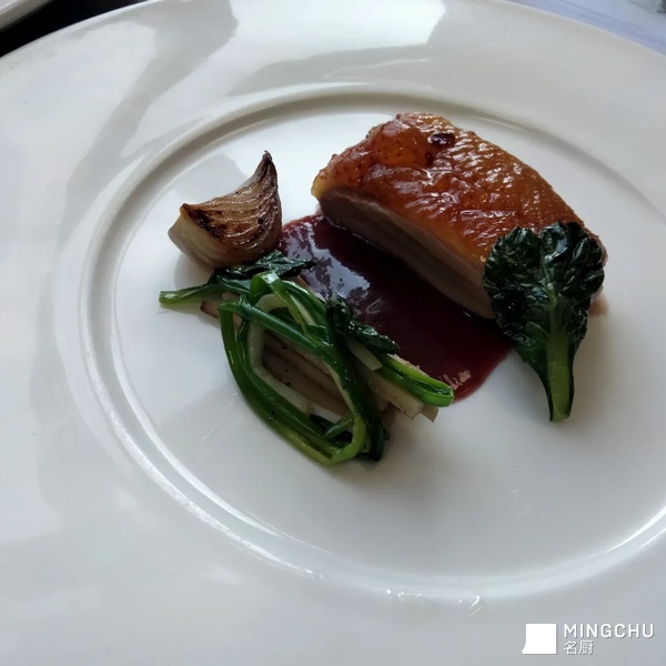 风干熟成烤鸭胸配/煎煮牛蒡和轻煎空心菜/干葱/佐鸭骨红酒汁