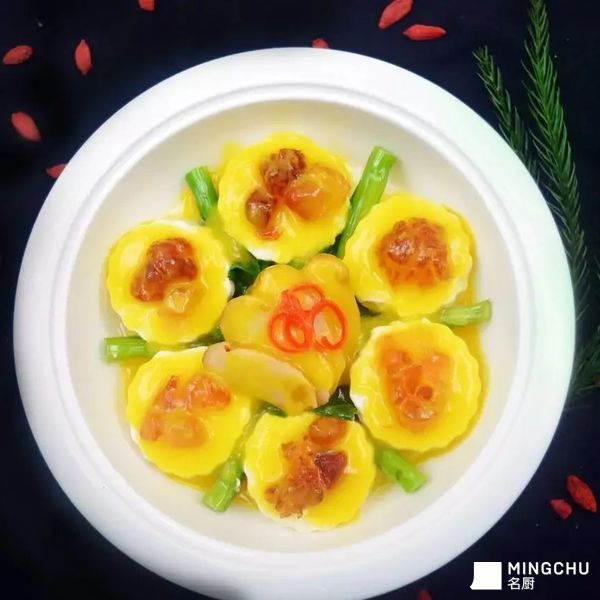 创意特色养生菜品,所谓白玉是用黄豆、核桃仁、花生等坚果磨成豆浆后加入牛奶、鸡蛋蒸制而成,细腻香醇、健康味美。桃胶是新兴的养生食材,是蔷薇科植物桃或山桃等树皮中分泌出来的树脂,具有清热、止渴、止痛镇痛、养颜、抗衰老的功效。将野生珍菌松茸用鸡油煎香后加入秘制浓汤煨至入味,再搭配白玉、桃胶与南瓜一起烧制,口味咸鲜,入口即化,口感嫩滑,汤香浓郁。简单食材与养生桃胶的完美结合,秘制鱼汤与珍贵野生松茸的自然融合,食材的精准配比和时间的完美掌控,为食客呈现出型美味鲜,养生健康的创新菜品!