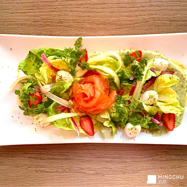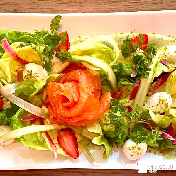 香草牛油果酱汁,自制烟熏三文鱼 ,脆芦笋和胭脂萝卜,新鲜马苏里拉…