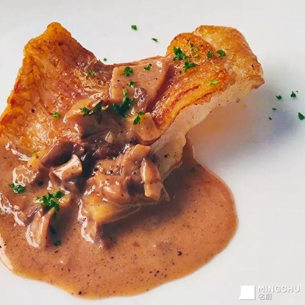 将鲷鱼煎出脆壳,搭配两种酒的褐菇出汁。