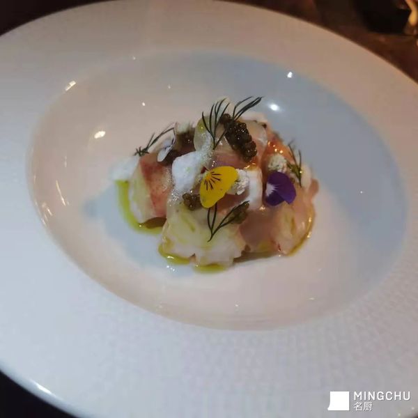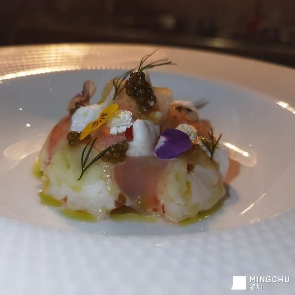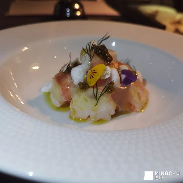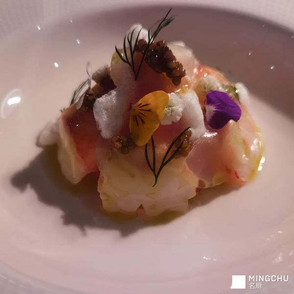 腌制龙虾,达式鲟鳇鱼子酱,西柚,莴笋,白番茄Foam