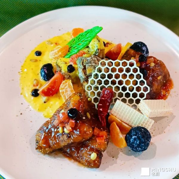 用玉米配上鲜奶、炼乳,榨成汁,味道香甜可口,配上番茄沙司更是诱人,鲈鱼用果酒、柠檬、海盐去腥,过粉炸制酥脆控油捞出,与酱汁融合,回味无穷。