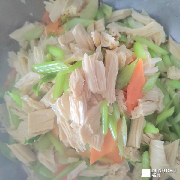 芹菜择洗干净,切菱形块,腐竹泡水泡软没硬心,切菱形块,配胡萝卜片,炒咸鲜口味。