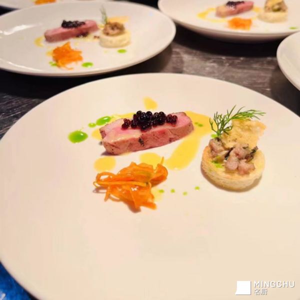 低温鸭胸/糖渍橙皮/鸭肉吐司挞/香橙奶油汁/ 香草油/黑醋鱼子