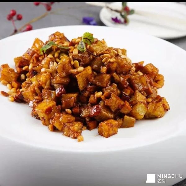 一位师傅灵感来源于红楼梦中的一道菜,微辣咸香带甜。茄子外酥里嫩的口感加上坚果,满口香气溢嘴。