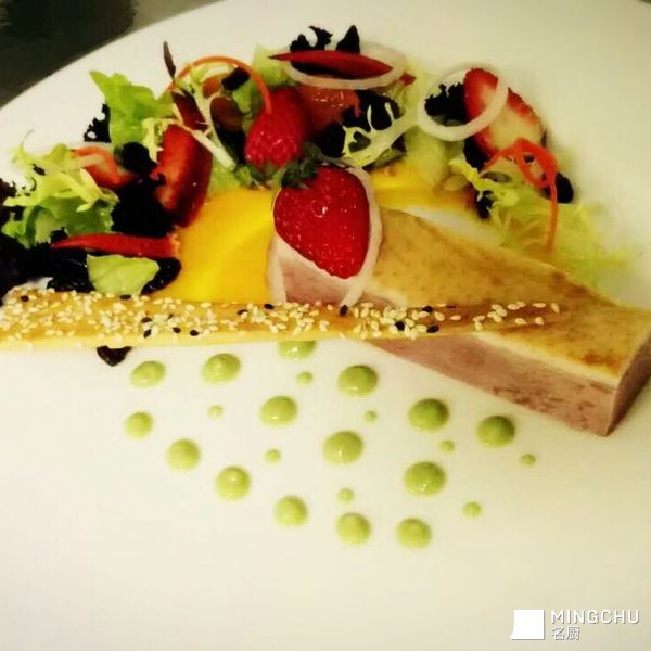 烟熏鸭胸配新鲜芒果酱,阿拉伯色拉,奶油草莓