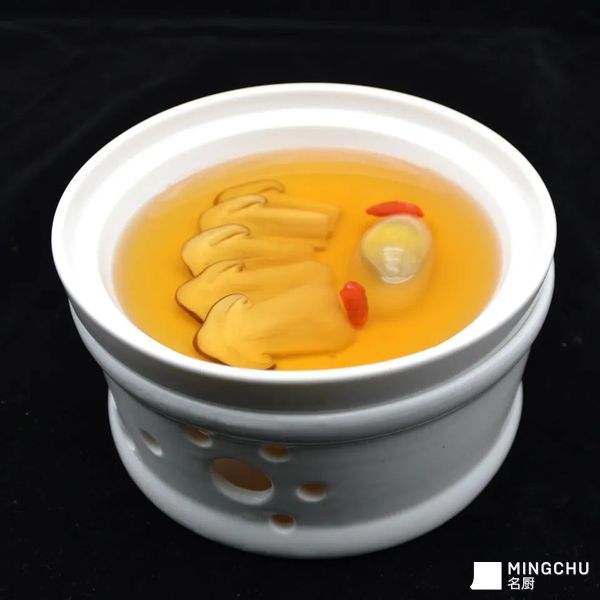 用老鸡炖好的鸡汤,最后在送鸡脯肉茸蒸4小时,汤清,鲜味浓郁,搭配鸽蛋,增加了炖汤的神秘气氛。