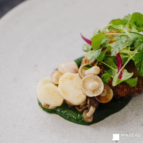 从法式猪头冻(Patéde tête)开场,呼应台湾人喜欢温暖的口感,做成可乐饼(croquette)炸肉球的形式。下面铺垫上用当季山茼蒿做成的酱汁,以及舞菇,成为讨喜小点。