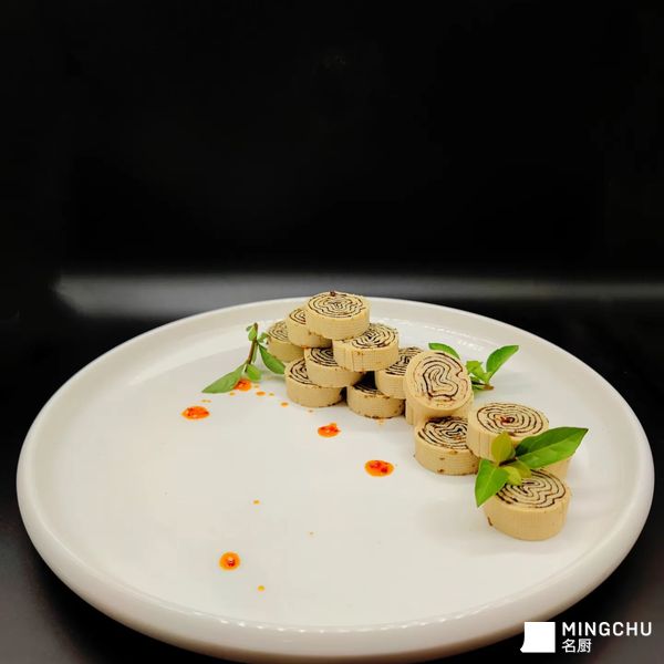 豆皮与海苔卷制而成,蘸红油料汁食用,鲜香可口。