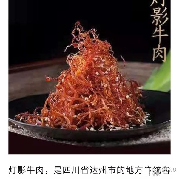 四川传统名吃灯影,薄如纸片,色泽红亮,麻辣鲜脆,香脆可口,营养丰富。
