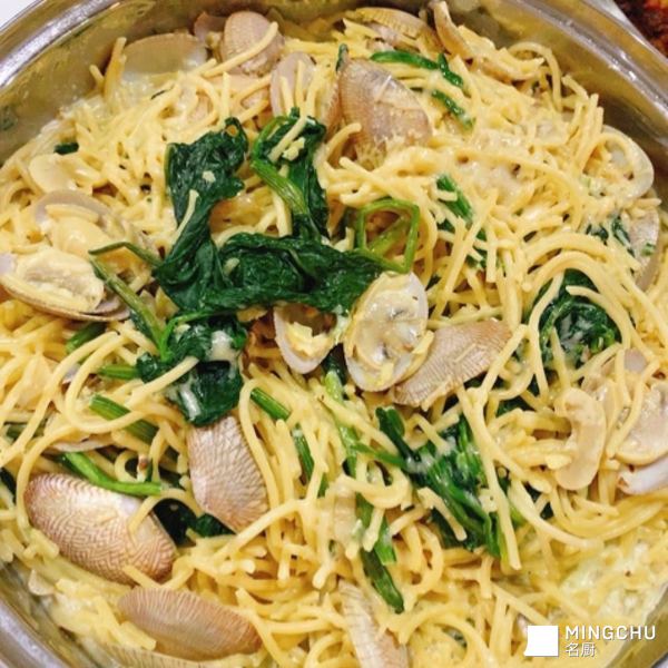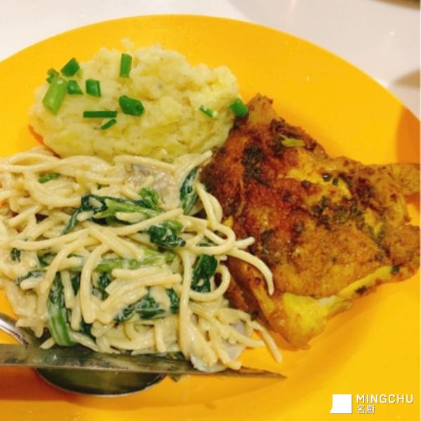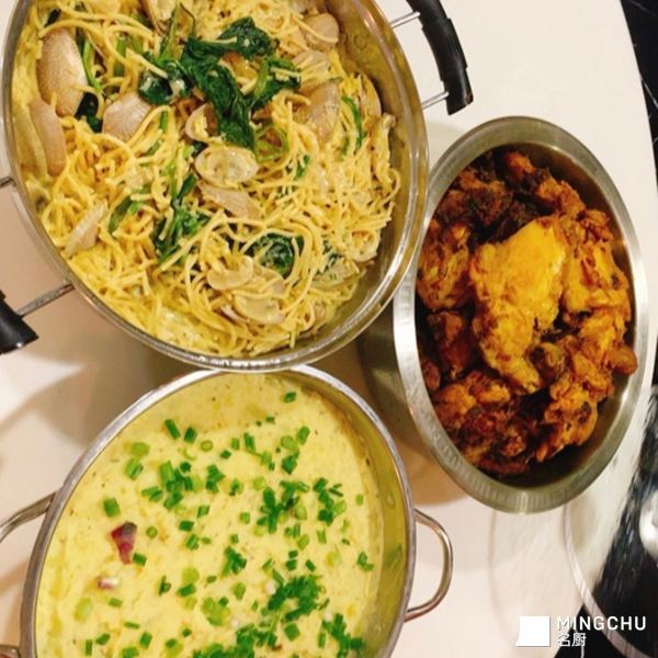 白汁芝士菠菜蛤蜊意粉🍝 芫荽黃薑煎🐔雞扒 蔥花土豆🥔泥