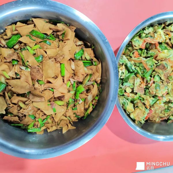 食堂员工餐青蒜苗肉片炒豆皮。