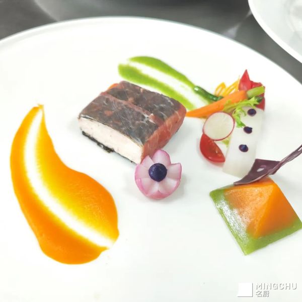 创新菜,通过讲鸡肉做成慕斯后,一次包上海苔 帕尔马火腿进行低温慢煮,用菠菜和南瓜制作三角啫喱后摆盘,低温主菜的温度一定要控制到位,否则肉质发柴