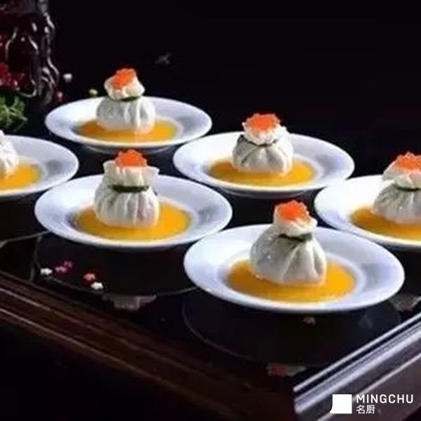 蛋清吊成蛋皮,包上什锦海鲜,韭菜段扎好,上放鱼籽酱,放在花胶鸡汤之中,犹如盛开的荷花,出污泥而不染。