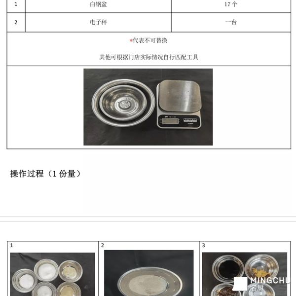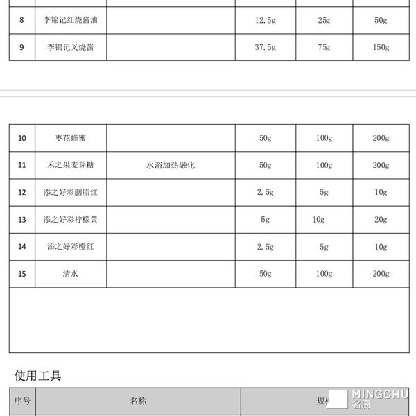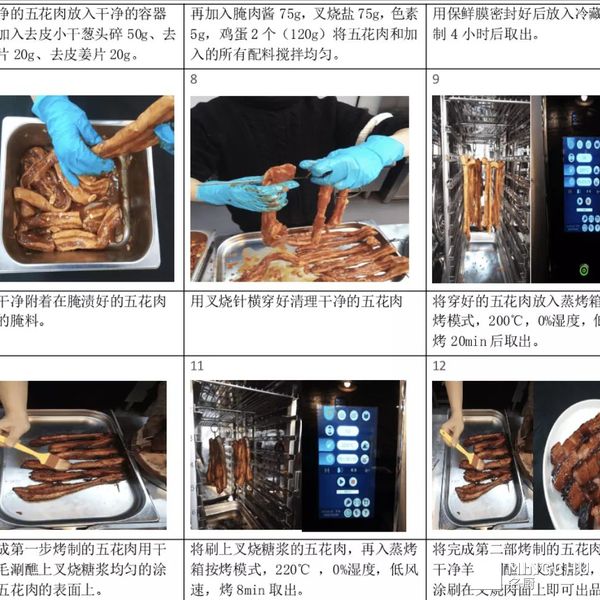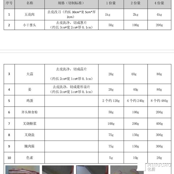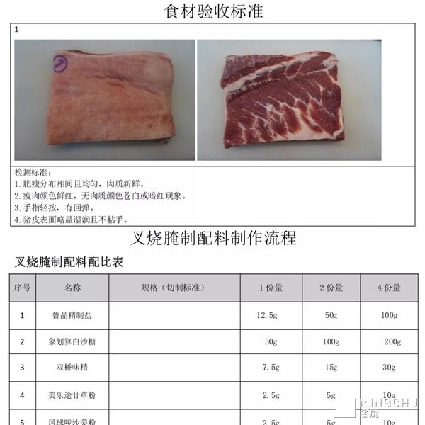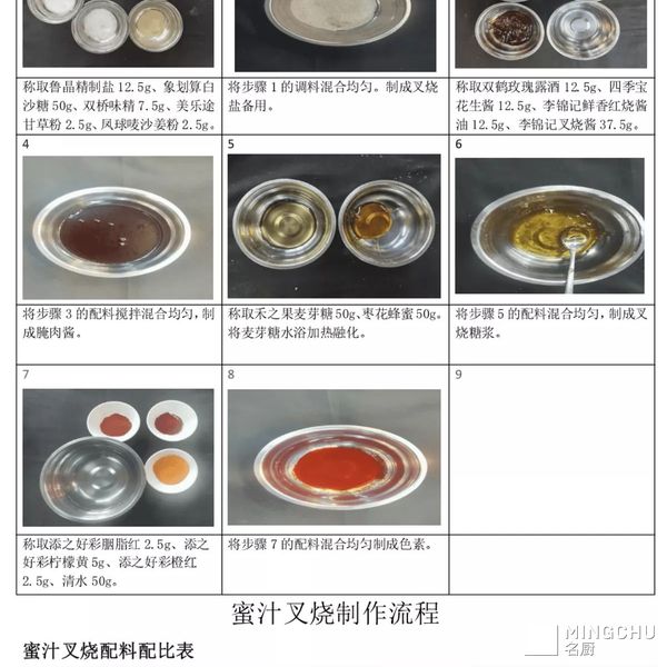 烹制一道菜容易,但每天都烹制一道标准的菜品就不易~备注:.1、叉烧盐配制:食盐50克、白沙糖200克、味精30克、甘草粉10克、沙姜粉10克2、腌肉酱配制:双鹤玫瑰露酒50克、四季宝花生酱50克、李锦记鲜香红烧酱油50、李锦记叉烧酱150克3、食用色素配制:水100克、添之好彩胭脂红5克、添之好彩柠檬黄10克、添之好彩橙色5克