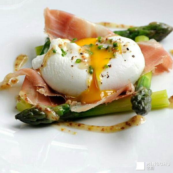 水波蛋蛋黄混合火腿,风味独特,搭配芦笋的脆嫩。