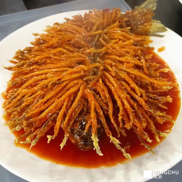 金毛狮子鱼是一道河北石家庄的传统名菜,属于冀菜系。金毛狮子鱼以鲤鱼或者草鱼为主要材料,用鲤鱼加工装饰后,炸制而成,色泽金黄,鱼丝蓬松形式狮子,酸甜适口,始于民国初期,最早由石家庄的中华饭庄名厨袁清芳所制!做这道菜最重要的讲究刀工,说实话自己由生到熟,这期间不知道手上划了多少处伤,鱼就不计其数了,真的是台上一分钟,台下十年功!