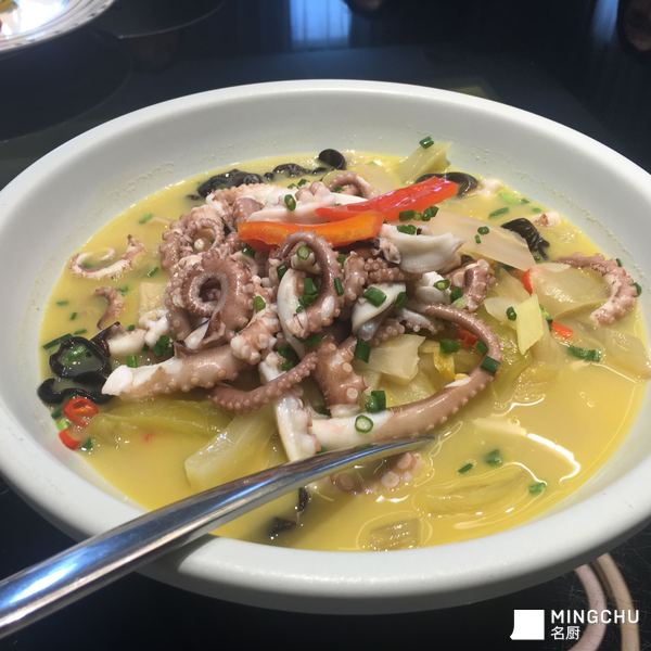 这个菜的灵感,来之余酸菜鱼的技法,把鱼改成活八带,口感爽脆,味道刺激,曾家食欲。